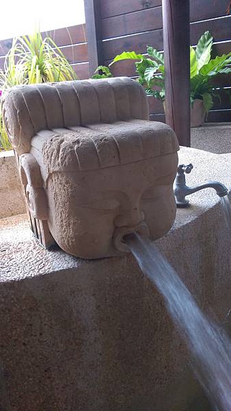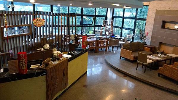 大廳櫃檯,在右手邊的沙發旁邊走出去有露天池的休息區,有泡麵販賣機